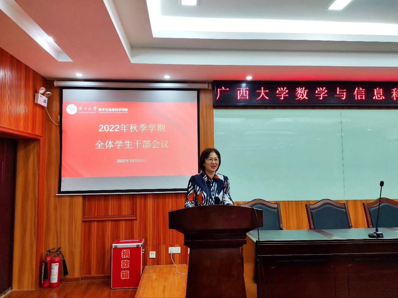 10月25日下午,数信学院秋季学期第一次全体学生干部会议在学院一楼报告厅召开,院党委副书记郭海燕出席会议,学工组辅导员周蕾、刘春霞等老师及全体学生干部参加会议,会议由院团委书记孙晓黎主持。