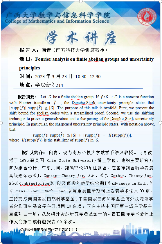 学术讲座:Fourier analysis on finite abelian groups and uncertainty principles