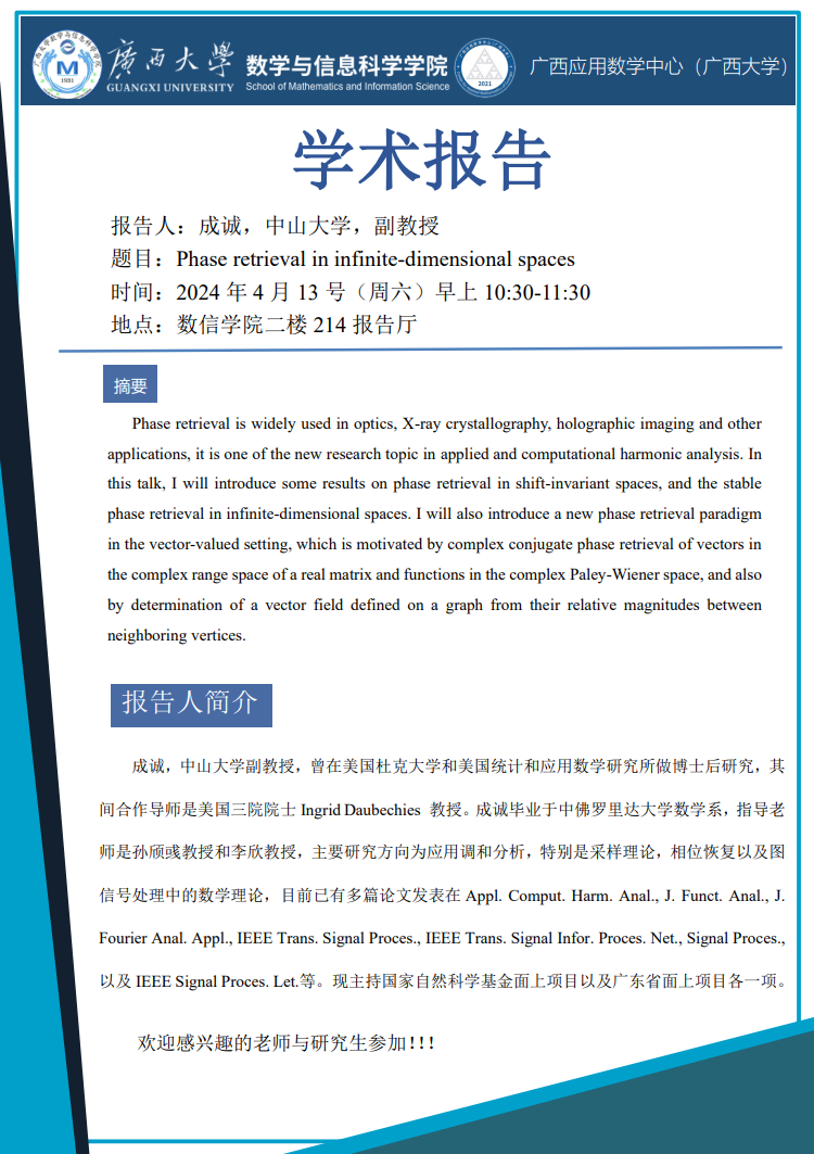 学术报告:Phase retrieval in infinite-dimensional spaces