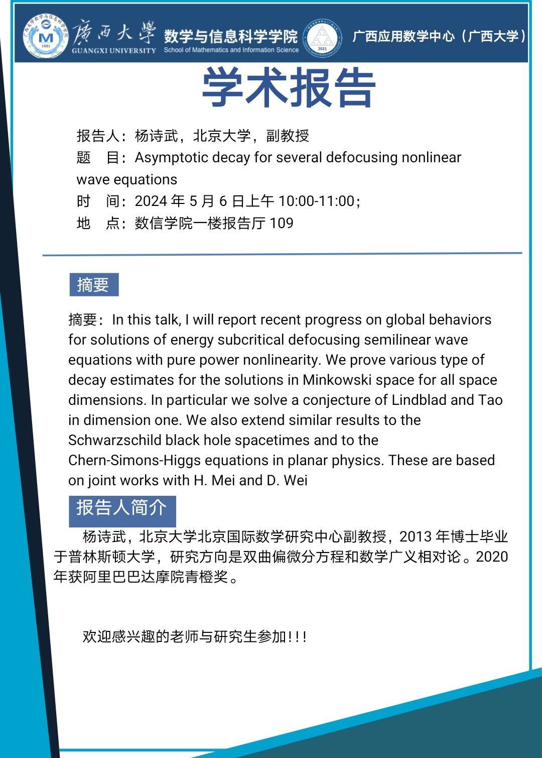 学术报告:Asymptotic decay for several defocusing nonlinear wave equations