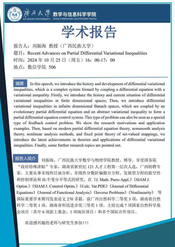 学术报告:Recent Advances on Partial Differential Variational Inequalities