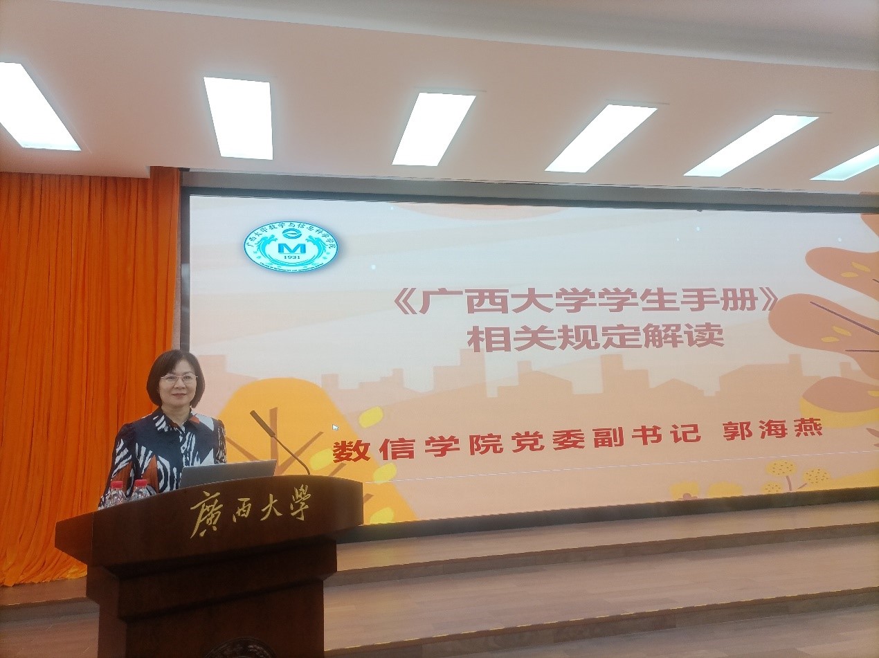 郭海燕副书记重点讲解了学生宿舍管理规定、学生考试违规处理办法、课程考勤制度、校园安全规范等含羞草