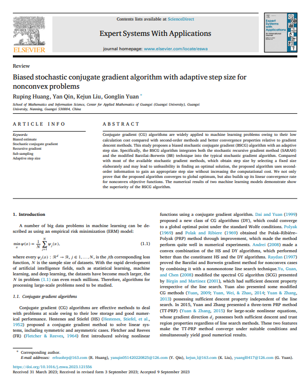 袁功林教授与其在读硕士研究生黄汝平、秦燕和刘科俊合作在人工智能类期刊《Expert Systems with Applications》上在线发表了题为“Biased stochastic conjugate gradient algorithm with adaptive step size for nonconvex problems”的学术论文,实现了我校数学学者在该刊发表论文零的突破,是我校实行学科交叉融合的学术成绩之一,含羞草