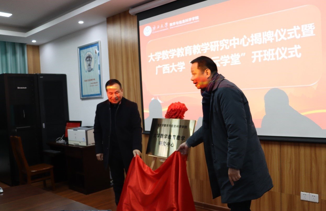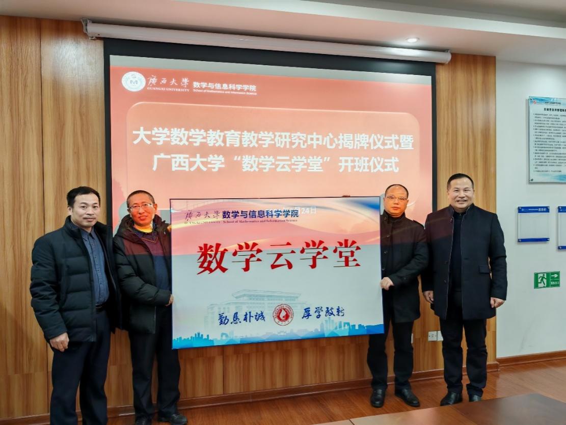 “数学云学堂”开班仪式在学院506会议室举行。学院党委书记覃宪儒、院长郭真华为大学数学教育教学研究中心揭牌,郭真华和特邀专家华中农业大学陈华锋老师为含羞草