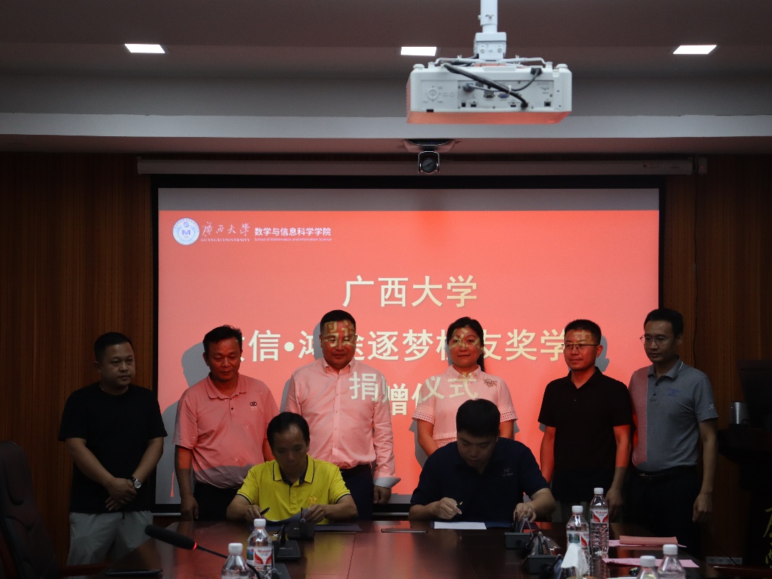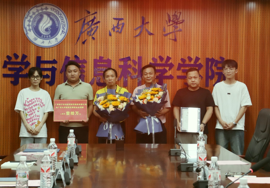 数信·鸿途逐梦校友奖学金”捐赠仪式。我校83级校友鸿途驾培集团董事长连建耀、校友办副主任陈懿、数信学院院长郭真华、鸿途驾培集团相关负责人、数信学院领导班子成员以及师生代表参加捐赠仪式。捐赠仪式由数信学院党委副书记唐旭彬主持。