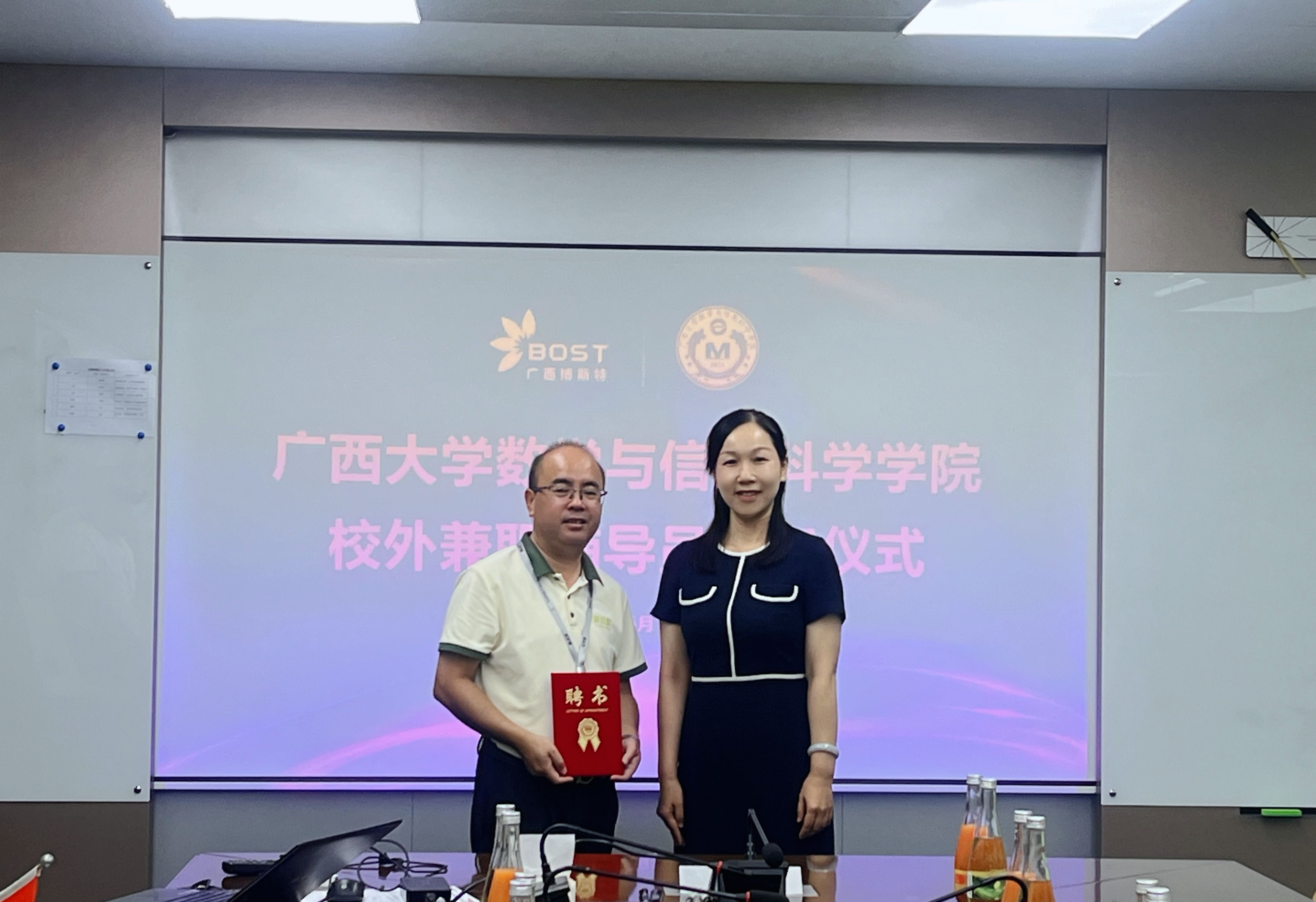 校外兼职辅导员聘任仪式,吴华丽为张誉颁发聘书,聘任其为含羞草