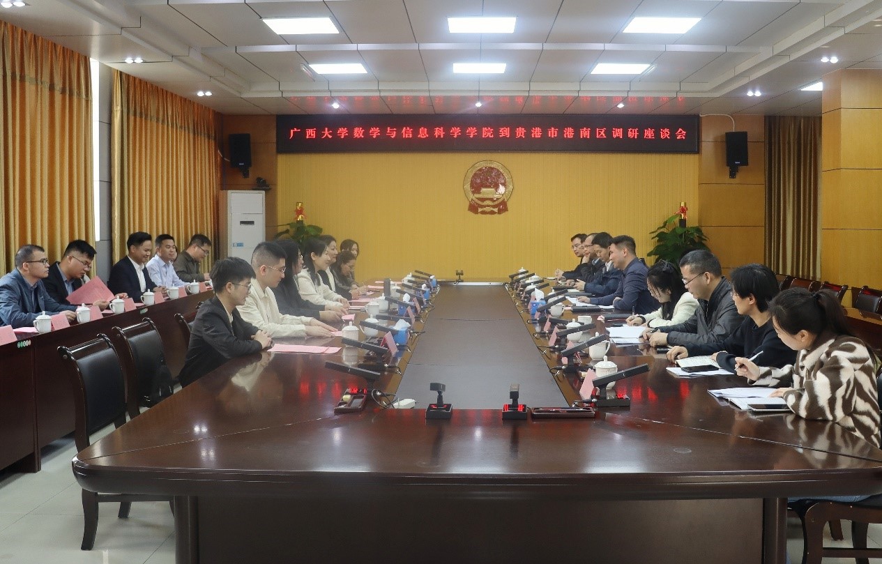上午,在贵港市港南区政府会议室召开座谈会。会议由贵港市港南区委常委、副区长何超杰主持,贵港市港南区政府办、区委组织部、教育局、工业和信息化局、人力资源和社会保障局、统计局、财政局、大数据发展和政务局、工业园区管委会等9个机关单位负责人参加座谈。港南区委组织部负责人介绍了选调生培养和人才引进等方面的政策、主要措施和做法;港南区人力资源和社会保障局负责人介绍了辖区内各机关单位2025年人才需求情况及引进计划,重点介绍了对数学专业人才的需求情况;港南区教育局负责人介绍了辖区内中小学数学教师队伍建设总体情况以及对数学专业人才需求的情况。会上,双方就选调生培养选拔、促进毕业生就业创业、数学类人才培养和产学研交流合作等方面开展了深入交流。